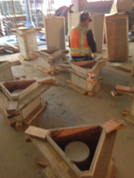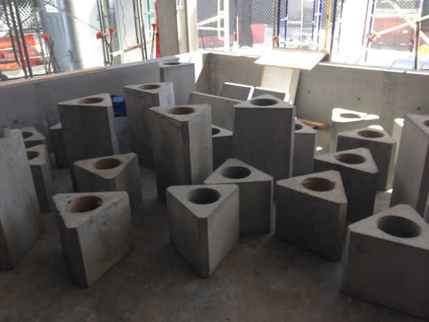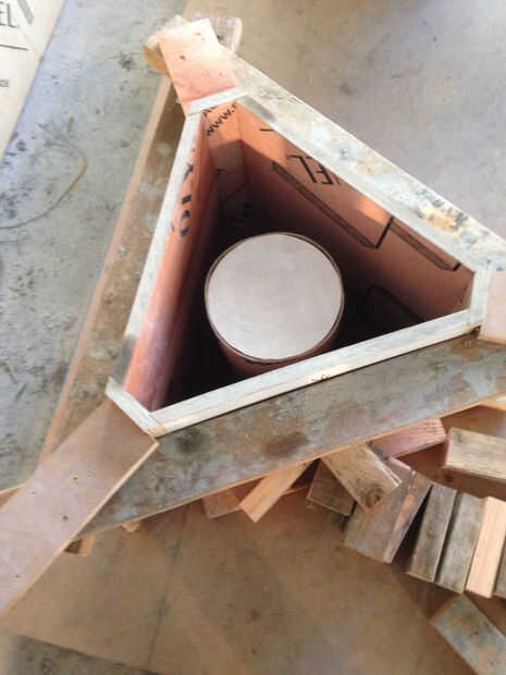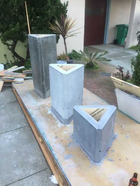 - Formas de pedestales fueron fabricadas partiendo de un sencillo módulo triangular en tres alturas diferentes. Se hicieron moldes de tablero de madera y partículas de 2 x 4. Mantuvimos la base hueco colocando un tubo de sono en el centro. Tiempo de curado total fue aproximadamente de 1 semana.