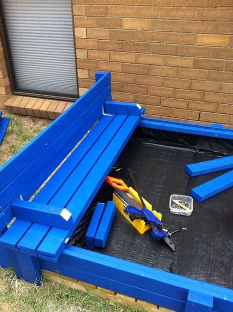 No conseguí una buena foto de este paso (la foto es bastante tarde en el proceso de construcción) pero es bastante fácil/auto explicativo - línea de la base y los lados con weedmat usando una pistola de grapas. Esto mantiene la arena en su lugar sino que permite el drenaje de aguas pluviales, etc. wee niño