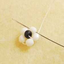 Hilo siguiente, en un grano de semilla. Para ello, pasando por el talón opuesto a la de semillas de bolas. Si lo haces correctamente, el grano de la semilla ahora se sentará en el centro. Pase el hilo a través de todos los granos para que sea más robusto.