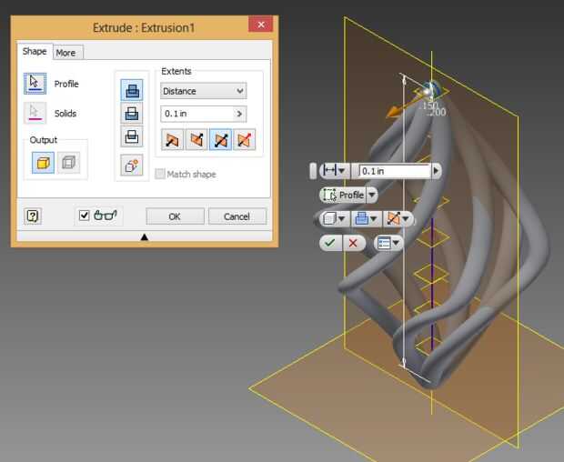 En la parte superior de la pendiente tendrá que hacer un pequeño bucle poner pendiente a. Encontrar el plano que corta el diseño en medio, estilo de perro caliente (como en mi foto) y hacer visible los pasos discutidos en la última diapositiva. Crear un dibujo 2D y hacer dos círculos concéntricos. Sacar el área entre las partes arriba de estos círculos. Para extruir uniformemente en ambas direcciones que debe seleccionar el cuadro bajo los 'grados' hacia el muestra un plano con dos flechas negras saliendo de él en direcciones opuestas. Puedes ver los seleccionados en la imagen.