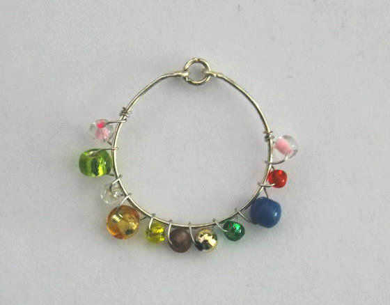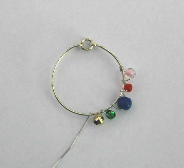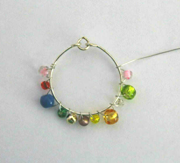 Seguir haciendo esto y agregar los granos uno por uno casi todo el camino alrededor del aro. Cuando haya terminado de agregar cuentas, envuelva el cable restante varias veces en el aro para asegurar.
