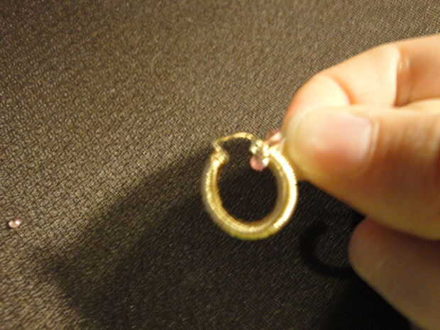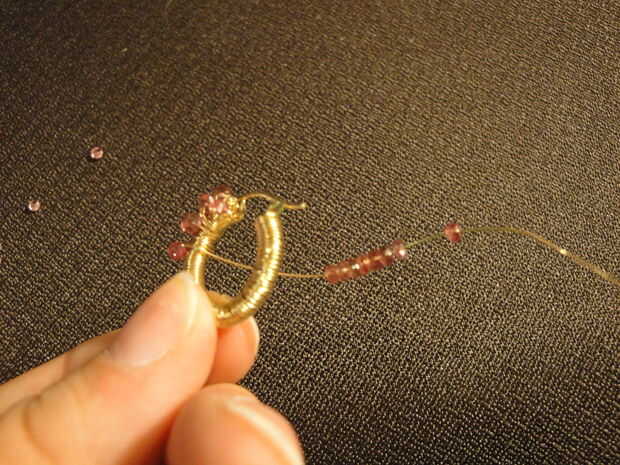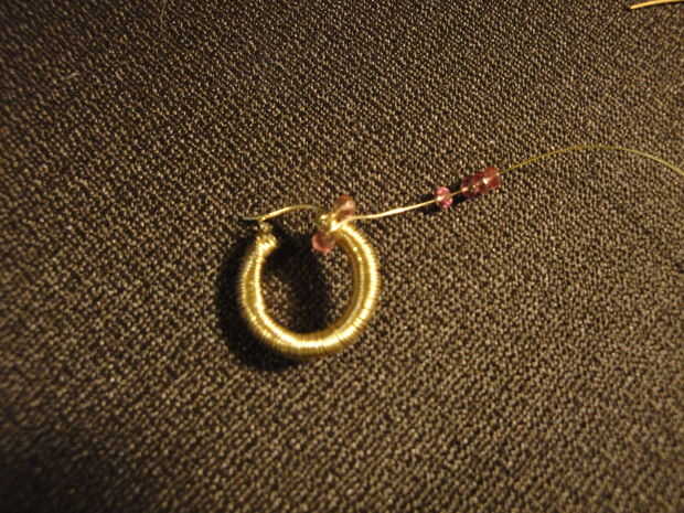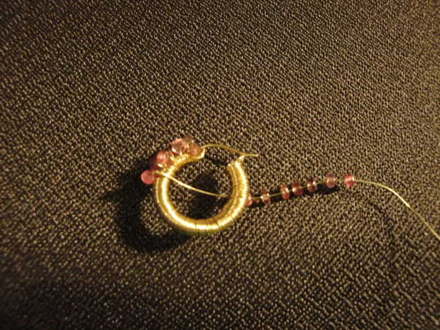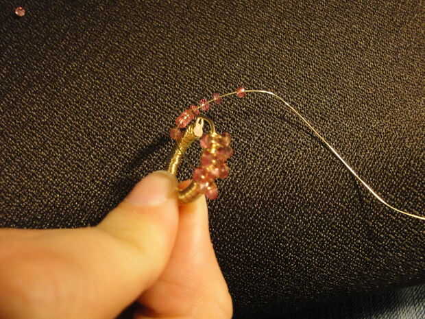 Poner el talón en el alambre y empújela hacia abajo hasta llegar al aro. Asegúrese de sobre dónde colocarlo, si tienes que volver atrás y mueva va a tomar tiempo y poner pequeñas abolladuras en el cable. Mientras que no está mal, tendrá más tensión a continuación, establezca las siguiente algunas perlas para asegurarse de que se alinean por las abolladuras. Generalmente coloco sólo un grano por loop, pero a veces, especialmente en la parte inferior he utilizado 2. Mis aros fueron demasiado pequeños para usar 3 que parecía una fila completa de granos en lugar de un "cluster". Pero usted puede colocar las cuentas sin embargo encajan mejor en su aro. Ir todo el camino hasta llegar a la parte posterior de su aro otra vez.