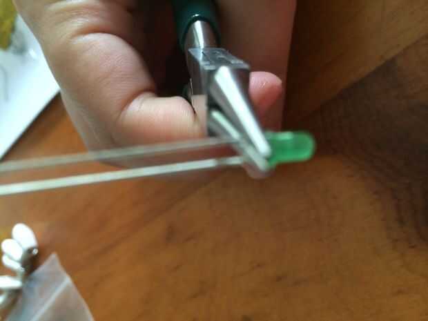Sujete el cable más corto del LED con los alicates redondos de la nariz como cerca de la base como sea posible