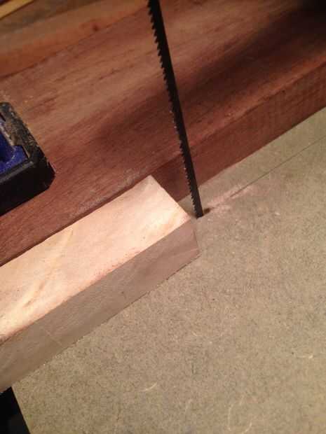 He creado una separación cero base para mi Dremel fret saw y afianzado con abrazadera en un trozo de madera en el espesor deseado de la hoja.
