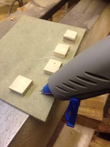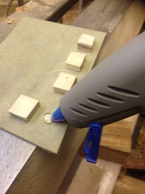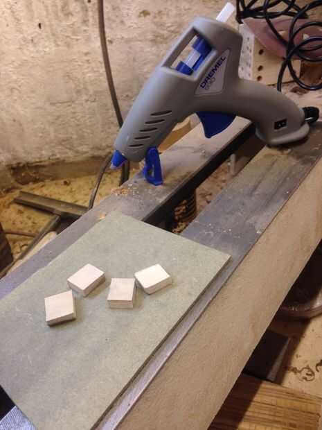 Con mi Dremel temperatura baja y caliente pegamento pegamento de baja temperatura pegué los cuadrados de espesor uniforme sobre una paz de chatarra de MFD. Esto facilita mucho el trabajo con la madera y reduce la necesidad de encontrar métodos de sujeción inteligentes cuando talla o forma.