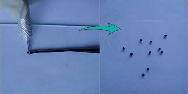 2. Cortar pequeños trozos de la línea y convertirlos en microesferas (unos 1-1.5 mm de diámetro) como se ve en la primera foto.