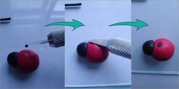 3. Tomar las micro esferas con la punta de la hoja del cuchillo de arte y colocarlos sobre el cuerpo de la mariquita (cuadro 2).
