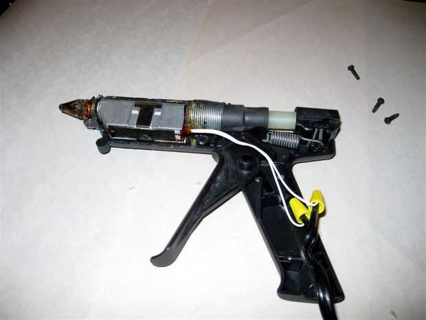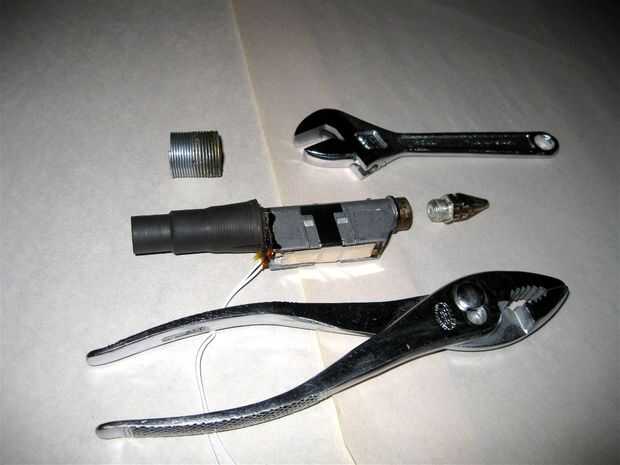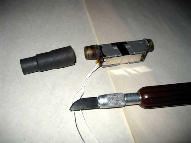 Una vez dejé abierta tomé la oportunidad de sacar todo y echarle un vistazo a lo. Lo primero que hice fue sacar las tapas amarillas y desconecte el cable. Los cables sólo fueron trenzados entre sí y los casquillos que sólo tornillo en por lo que no fue difícil. La punta enroscada y tenía el pegamento que mantiene en, pero un trabajo con una llave tiene suelto. El manguito de goma y el muelle, probablemente un disipador de calor, probablemente no es necesario salir, pero a un poco más fácil el siguiente paso.