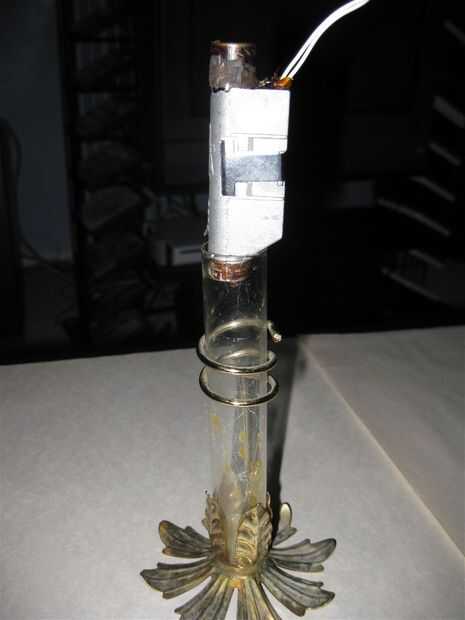 Ahora todos que lo hice aquí, me estaba el elemento de calefacción en un pequeño vidrio vela titular que tenía puesta alrededor. Después de eso volvió a conectar los cables en el enchufe. Entonces lo tenía configurado por una ventana, y que era estable y no ir a la roca o caiga. Luego le enchufamos el cable. Igual que siempre el metal calentado para arriba, solamente el pegamento drenado de la caja, dejando claro a través de todo el camino. Aparte de los hilos que derritieron el pegamento en sí mismo. Un obstáculo imprevisto que se tratarán más adelante.