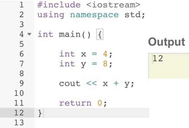El comando utilizado para imprimir algo en la pantalla (caja de salida) es cout << seguido de lo que desea imprimir. Primero se imprime la suma de sus variables. Esto se muestra en la figura como cout << x + y;
