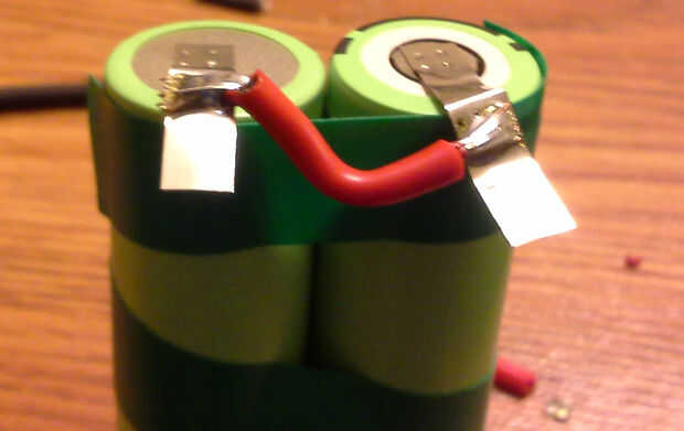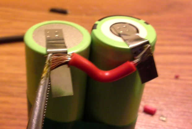 Usted tendrá que soldar entre sí positiva ficha en una celda a la ficha negativa en la otra célula. Se puede soldar cualquier forma que desee. Lo que hice es mediante la creación de un puente usando 18AWG cable, luego usé pinzas hemostáticas para mantener el alambre en la ficha mientras se suelda.