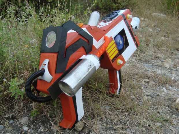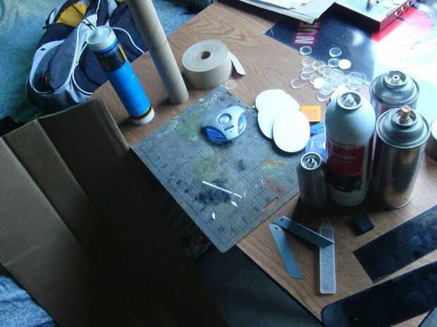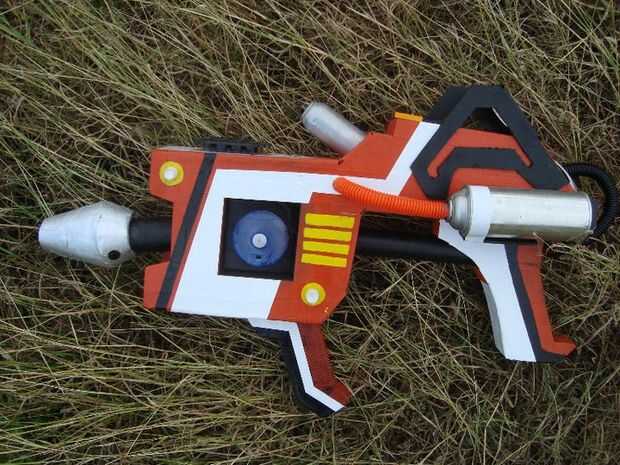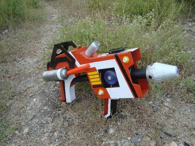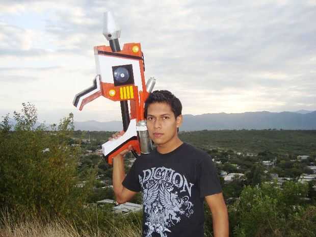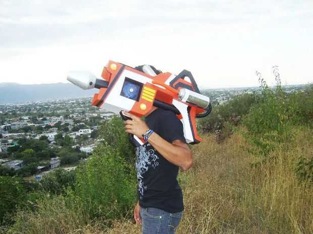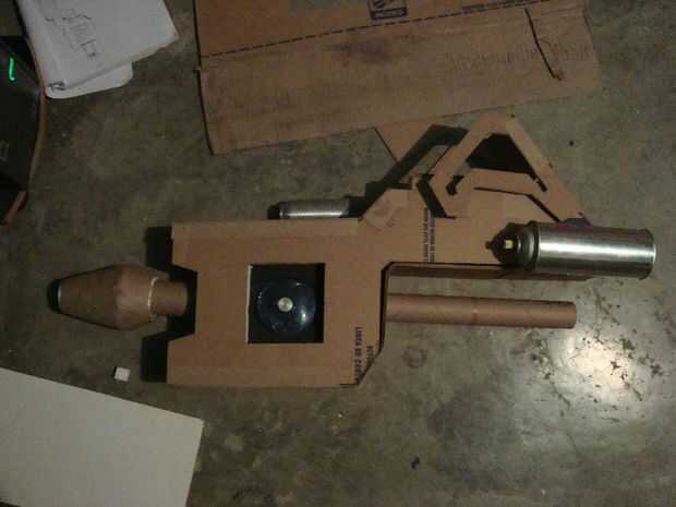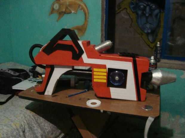 por ejemplo para esta arma hice aumentando cartón corrugado. malla, vinil, pintura acrilica, tapones de pastas de dientes, partes de accesorios de un cpu de computadora, y mas.