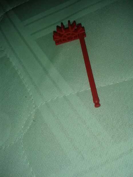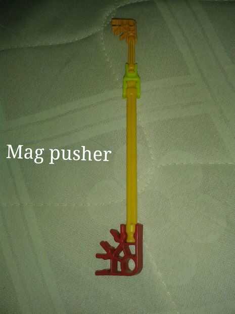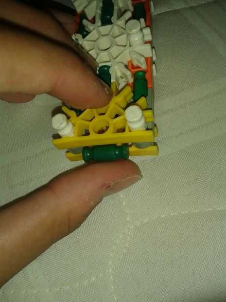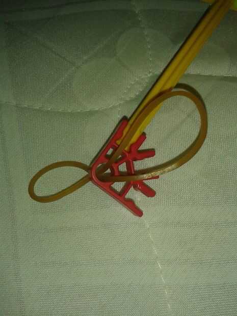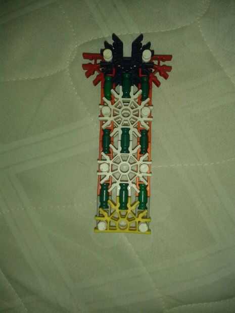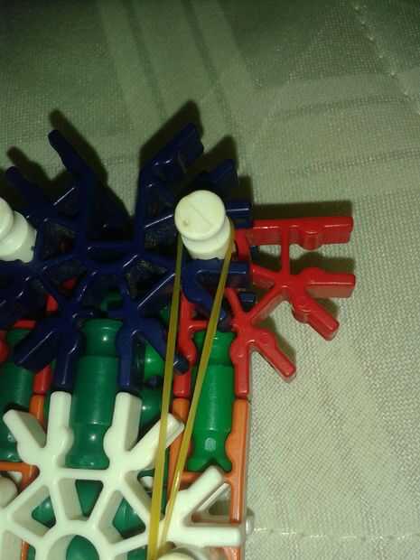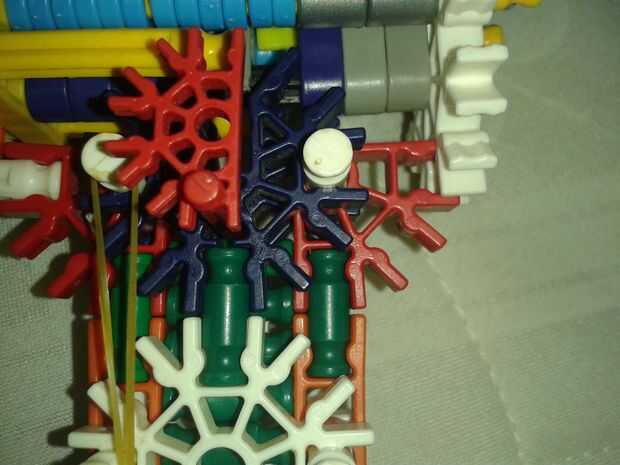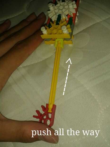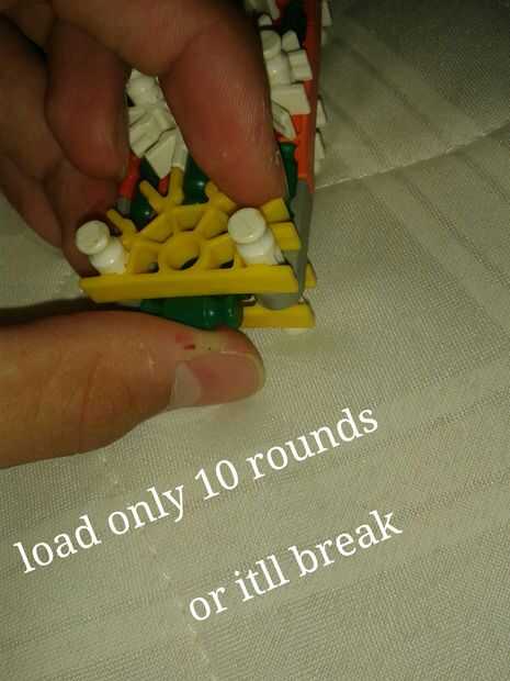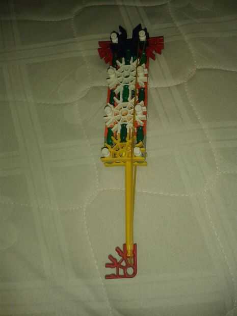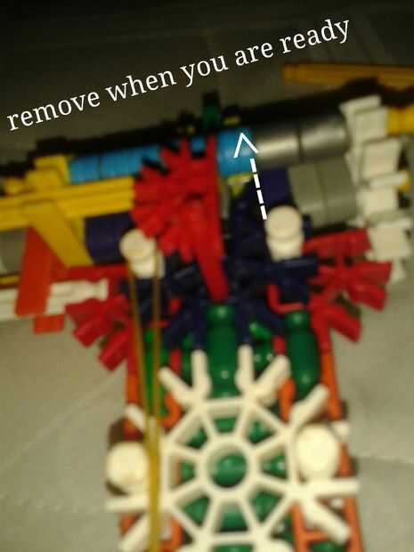 esto es un arma de gatling de K'nex mano que dispara barras amarillo casi 10 pies (que es cm 284 personas en Reino Unido)Es fácil de hacer y utilizar.Mis bandas tiraron las cañas muy duro y rápido, para no apuntar a nadie!!Este es un problema con el