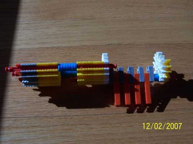 esta es un arma fuerte KVG. Puede tirar nada de lo que cabe en el barril. Utiliza solamente pedazos de KVG básica y una buena banda de goma. Si utiliza barras azul como munición seguramente conseguirá su objetivo. Este es mi primer instructivo sea ta