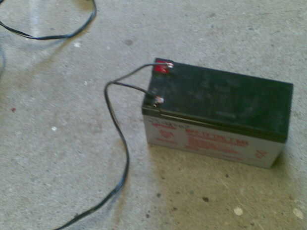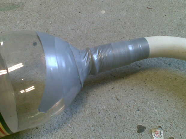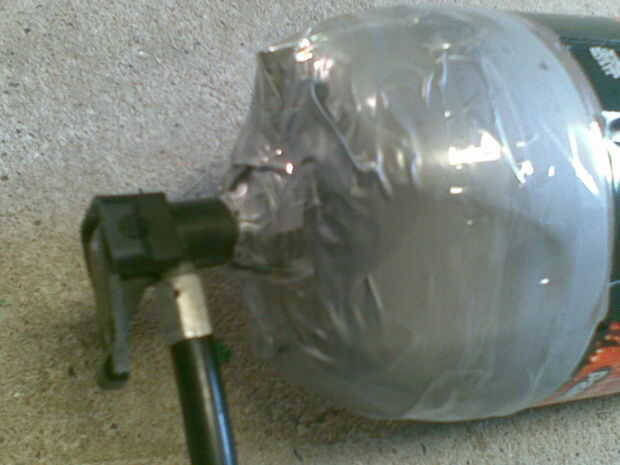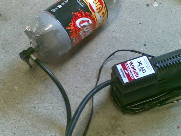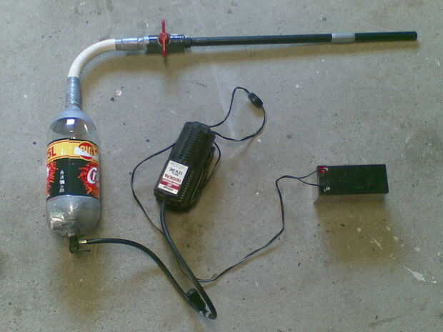 es una simple válvula de bola espita neumática pistola pero en lugar de una bomba de mano utiliza una bomba eléctrica 12V (originalmente una bomba de coche), vuelto a una batería de 12V que tenía puesta alrededor (como haces), utiliza una botella de 2,25 L para el almacenamiento de aire supongo. Por cierto utiliza un infierno de un montón de cinta pato! algo a tener en cuenta. recargas en unos 10-15 segundos, en comparación con el bombeo para sobre 1-2 minutos.