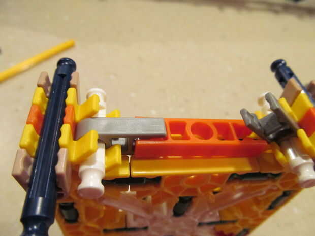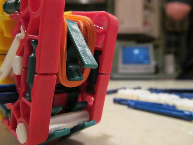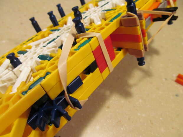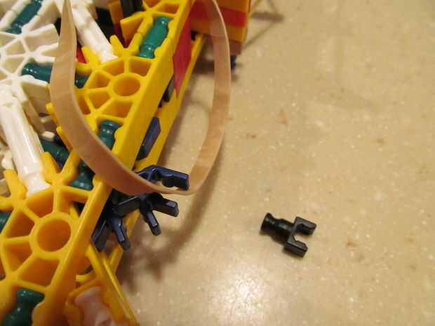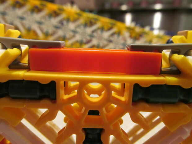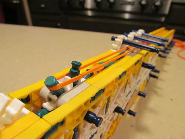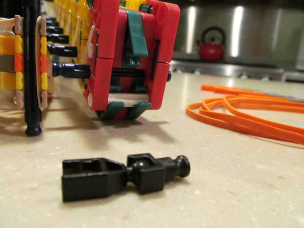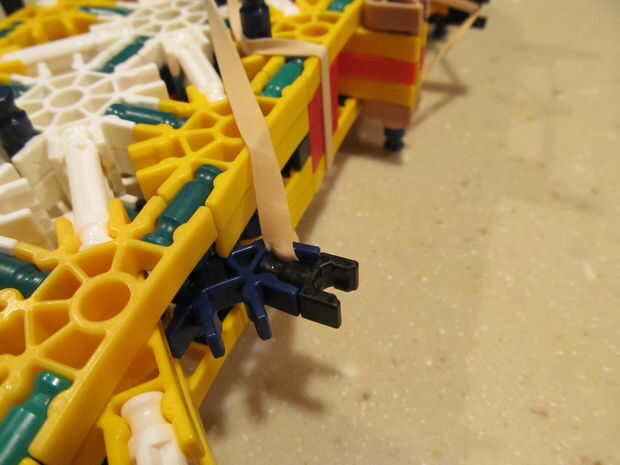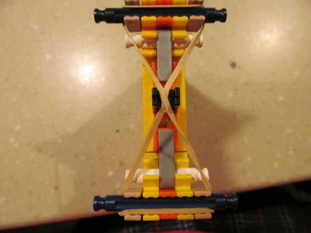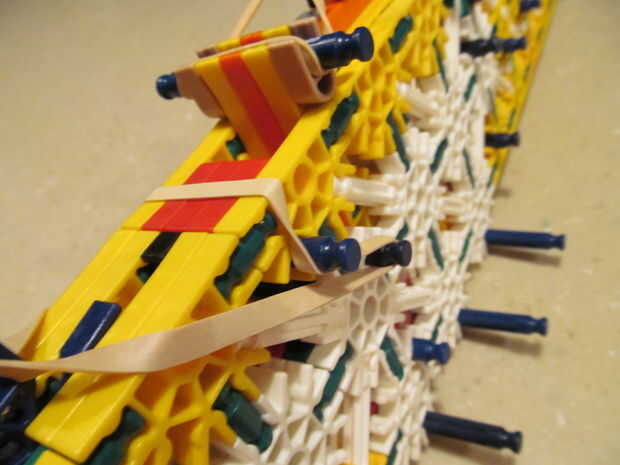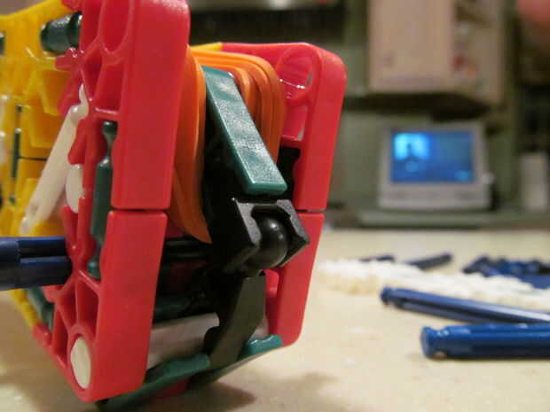 32. tirar hacia atrás las bandas una por una, manteniéndolos bajo las barras azules y ponerlos en el trinquete. La forma más sencilla de hacerlo es sacar las tres barras azules a la izquierda del camino y luego tire de las bandas. A medida que agrega más bandas, gire el trinquete hacia atrás. Las bandas se procederán a ir en el arma. Ahora empuje hacia atrás las barras de azul a la derecha y carga su mag (siguiente foto).