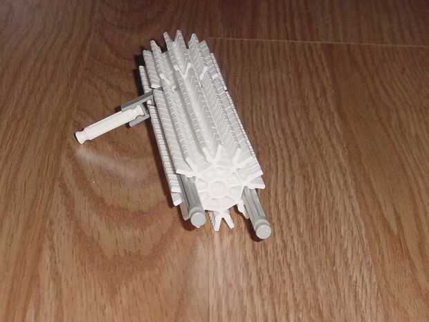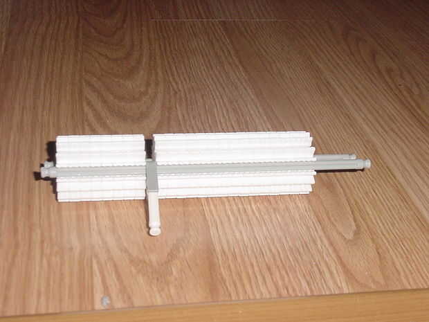 primero tomar una de las barras grises y empezar a poner conectores blanco en él. luego coloque el lanzamiento del perno de la leña en el conector gris tras el conector de 8. ahora sigues colocarle los conectores blanco hasta que se han utilizado todos. después de que haya que pone otra barra gris en el otro lado
