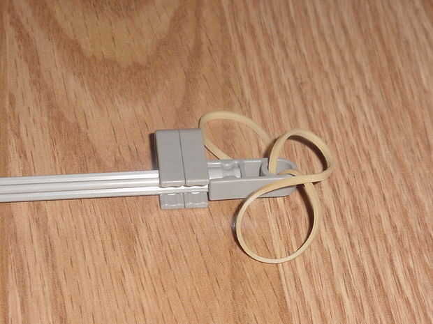 primero tomar la barra gris y dos de los conectores snap sobre las formas de lado y luego el otro conector en el extremo del clip. Cuando termine, poner la goma elástica a través del orificio en el extremo del conector gris.