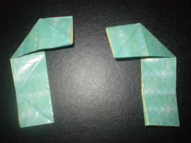 Ahora, esto puede parecer un poco duro, pero es fácil. Permite decir que cada rectángulo tiene 2 partes separadas por el doblez que hiciste. En uno de los rectángulos pliegue un lado arriba, en el otro rectángulo doble ese lado hacia abajo, tienen que ser opuestos.
