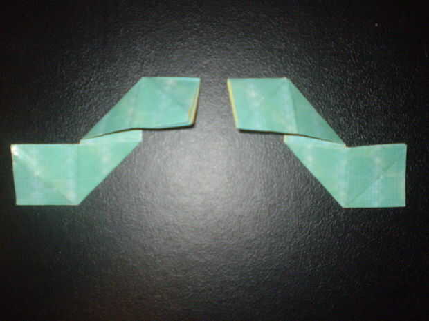 Ahora doblar la otra mitad del rectángulo lo contrario, el hacer lo mismo del otro rectángulo. Las dos piezas que tienes deben ser imágenes de espejo como es mostrado en la imagen.