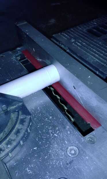 En la foto puedes ver que utilizo un C-clamp para sujetar el calibre de ingletes de mi sierra de mesa en el lugar. Me aseguré de cuando en lugar el tubo se coloca muy ligeramente detrás del eje.