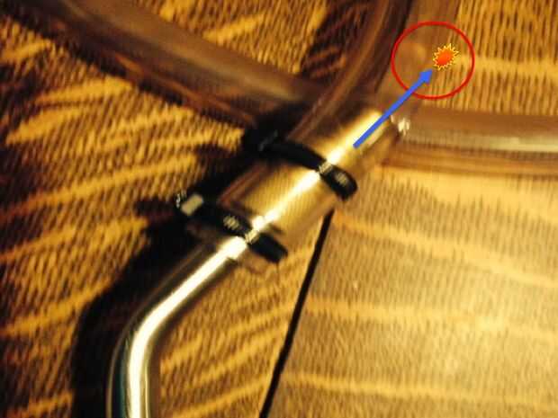 Observe la flecha azul y el área dentro de un círculo en la foto. En la conexión de la punta del soplete, trate de evitarlo. Ruta de la tubería para que el fuego natural persigue el tubo sin encontrar ángulos agudos ni torceduras.