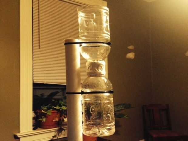 El ensamblado de la botella al final de la tubería de PVC con cremallera. Observe cómo he utilizado las ranuras en la botella. Usted querrá este es ceñido, pero no lo suficientemente apretada como para aplastar las botellas. La Asamblea de la botella funciona como una boquilla de Laval. Más información sobre eso aquí.
