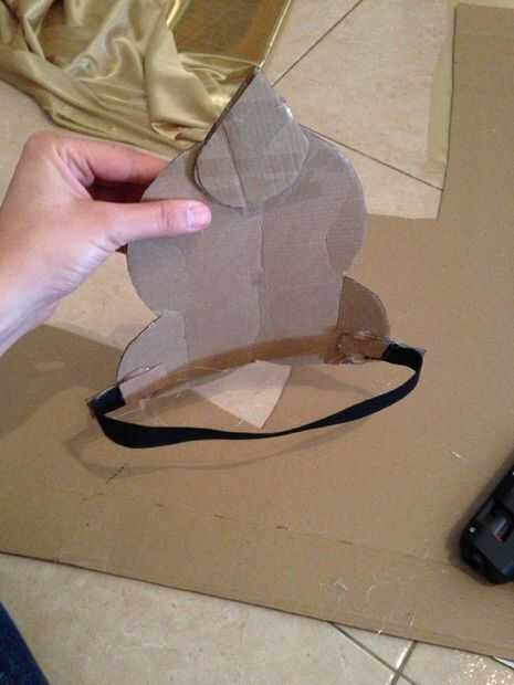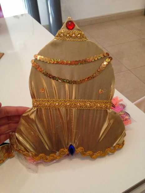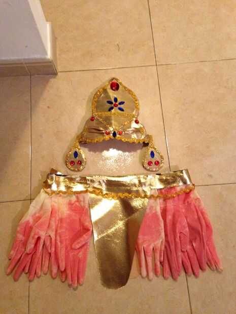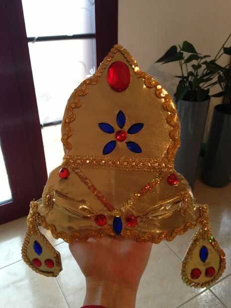 Con el cartón hacemos parte de los accesorios. En este caso la corona de Kali.Dibujaremos un patro de corona y pendientes, el cual posteriormente forraremos con tela dorada y decoraremos con pieras de colores, para ello vamos a usar una pistola de cola termofusible. Le colocaremos un elastico para fijarlo al contorno de la cabeza