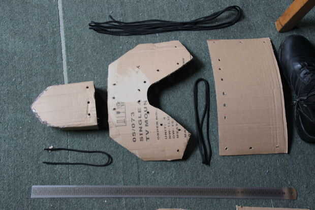 Por lo tanto, puse tres agujeros bastante uniformemente en los casquillos del dedo del pie para que pudiera unirme a la sección de tobillo. Puse 6 agujeros uniformemente espaciados en la base de la sección de shin (para conectar la sección del tobillo) y 3 agujeros en dos de los otros lados (para asegurar el cartón alrededor de mi pierna).
