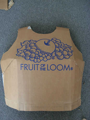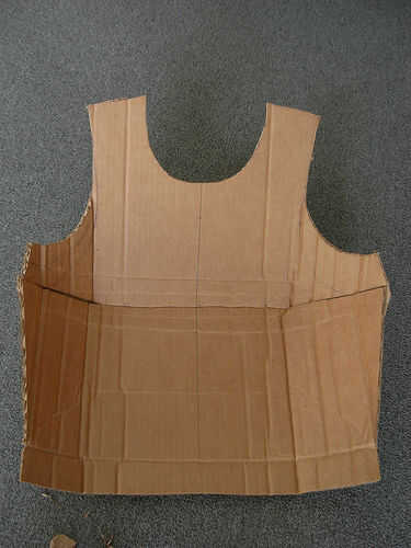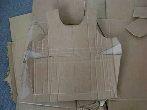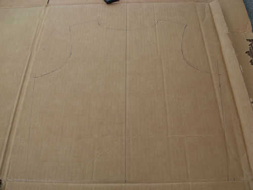 Dibujé el frente con dardos en el busto por lo que el blindaje sería doblar por ahi. (No se molestan en poner cualquier dardos en la placa trasera y esto estaba bien). Una persona menos tetona necesitaría menos de un dardo, pero la mayoría de las personas tendrá al menos una pequeña. Estamos todos más curvier en frente. Coloque la cintura de cada pieza en el borde de un pliegue existente, donde la caja original tenía un borde. También a la izquierda aproximadamente una pulgada de cartón extra allí fuera de hábito, pero resultó que esto era bueno (ver paso 6 sobre las hombreras).