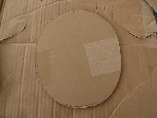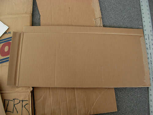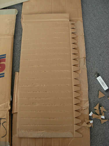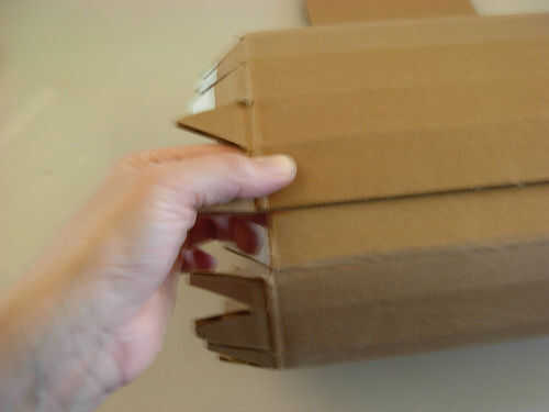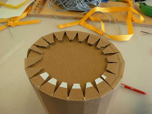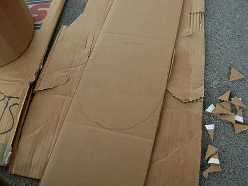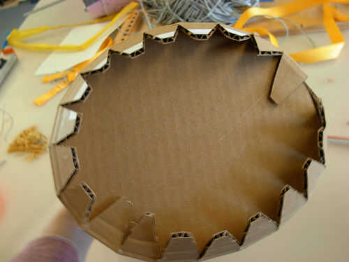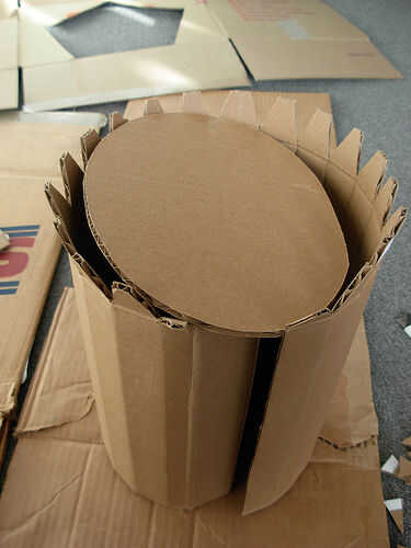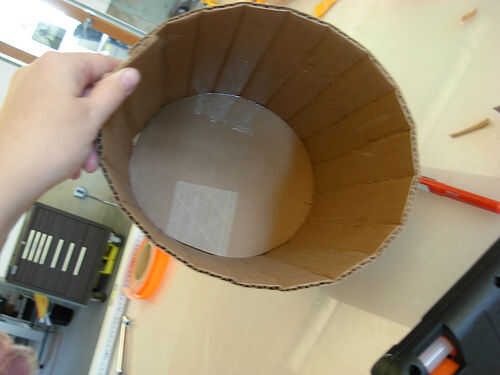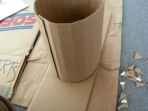 Cortar el casco en el borde de un borde existente de la caja original y pasó aproximadamente una pulgada. Hice un montón de cuentas vertical, después de lo cual pudo fácilmente enrollar la cartulina. Yo en rodajas pequeñas V de la parte más allá de la foldline existente, para que no interfieran cuando el cartón se curvo en un círculo.
