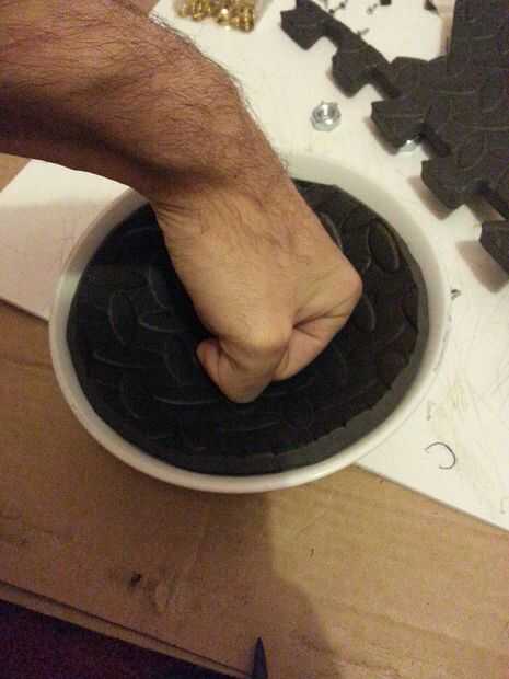 Luego coloca la espuma sobre el tazón de fuente y utiliza mi puño para presionar en la forma de tazón de fuente de la espuma. (utilice guantes para proteger las manos del calor) ;)