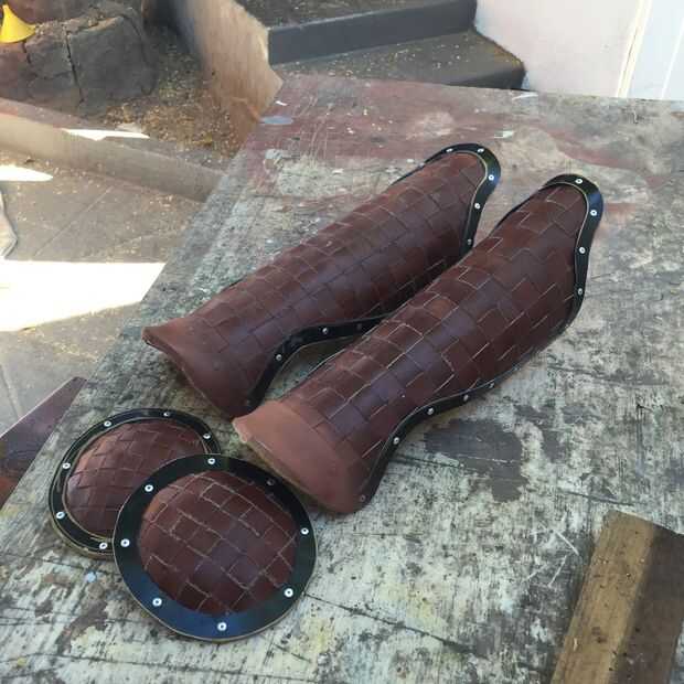 Usando las mismas plantillas, cortar piezas de plástico del ABS de la misma forma y luego cortar la misma forma del corte fuera en aproximadamente 1/2". Esto me dio una pieza de adorno que pude poner encima de la armadura de cuero y mantiene pulsado, con remaches.