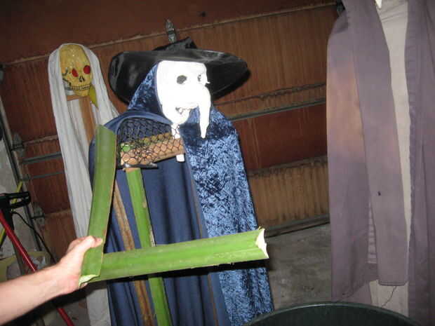Add arms. Tomar una rama de árbol de Palma y cortar al tamaño que desee los brazos para ser. Corte hasta la mitad y las dos piezas de nuevo juntos en un ángulo del tornillo. Esto hará que un codo. Luego atornille bien el brazo en la armadura. Repetir este proceso para hacer un segundo brazo.