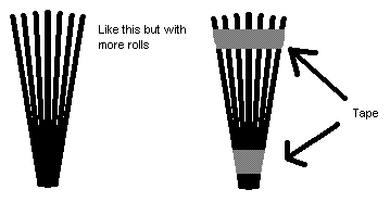 Una vez que tengas suficientes rollos, usted debe con cinta adhesiva. Alinee sus rollos para que los extremos se reúnen en un lado pero el ventilador hacia fuera cerca de la cima. Cinta adhesiva de 1 pulgada de la parte inferior. Otra vez aproximadamente 3 pulgadas de la parte superior de la cinta.