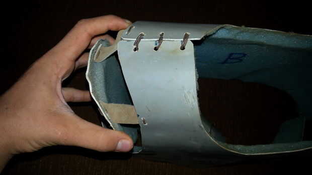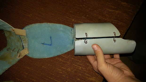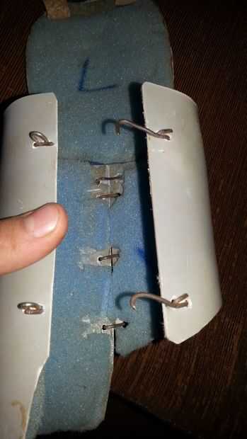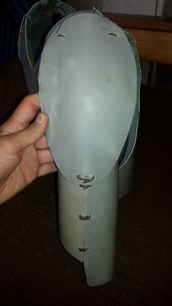 Después de terminar la coraza y la placa y unirse a ellos juntos, es tiempo de pasar a las piezas del brazo. He utilizado una bolsa si arena como un molde temporal para los cojines del hombro, pero puede usarlo que quieras para moldearla. Las hombreras están montados a la mama y la placa por algo flexible. Cadena funcionará, pero utilicé restos de cuero. Debe colocarse lo suficientemente lejos de la coraza que no sea incómodo. Para moldear el brazalete, debe encontrar algo redondo que es del tamaño adecuado para el PVC alrededor del molde. Las piezas de la banda de dos brazo se conectan entre sí por lazos zip (o alambre) y también usan el gancho y el lazo para subir y bajar. La hombrera está conectada directamente en el brazalete, para que sea un traje de una sola pieza. La hombrera necesita conectarse en algún lugar, por lo que se conecta a la coraza y brazal.