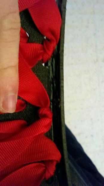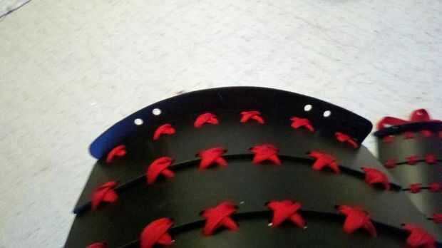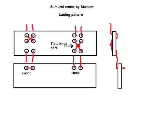empezar a roscar a la plantilla de abajo pero no apretarlos como vas. desde la parte inferior y vamos usando una cadena entera de arriba a abajo y lo atan en la parte superior. para cada par de agujeros que usará un hilo. después de todas las piezas se capturan hasta la parte superior del lazo con un nudo doble y cortar el exceso hace que estén bien sujetos antes de mano. usted quiere poner un poco de pegamento en el nudo y desde los extremos del hilo para que no se separan. hacer esto para todos los muslos de la armadura y el pecho.