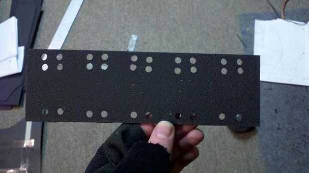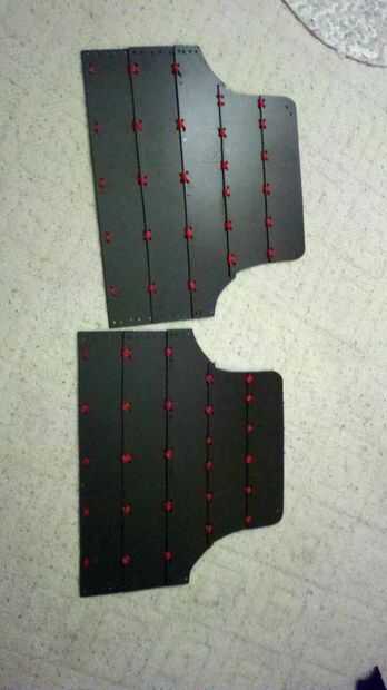 una vez tienes tu material cortado a la medida del diagrama las hombreras hombro y segmentos de la parte superior del muslo. para mis hombros he utilizado 4 3 x 6" para cada hombro y los muslos usé 4 2 x 5" con un total de 12 segmentos para los muslos. una vez que tienes corte taladro de los hombros y los muslos con la misma broca como la armadura del pecho y en el mismo diseño con los 3 pares vertical de los agujeros. los agujeros más utilizas mejor se verá la armadura. personalmente perforé pares de agujeros cada pulgada.