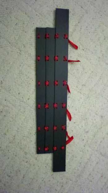 sólo como cada otra pieza de la armadura medida alrededor el casco para conseguir un buen ajuste entonces simple corte 2 o 3 segmentos de 49 cm x 5 cm y taladre orificios en y enrósquelos en consecuencia. :) se pueden conectar los segmentos de todos modos usted elige. sólo caliente pegué y los huecos que había entre los segmentos y el casco lleno de silicio negro y alisado hacia fuera.