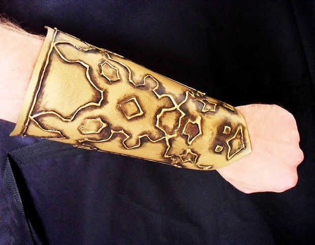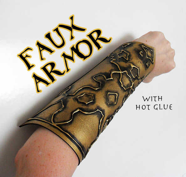En este Ible, va ser que muestra una técnica diferente para agregar a su arsenal; detalles a mano alzada con pegamento caliente para crear diseños en relieve-mira, como si fueron dibujados con el metal fundido o martillados desde atrás, como en el trabajo de técnica "repousse"del metal. Es versátil, fácil de ejecutar, y cuando todo termine Nadie sospechará que proviene de una pistola de pegamento! Yo voy crear una pieza de tipo guantelete simple en las fotos, pero sabe que se puede aplicar este método a cascos, máscaras de la mascarada, baberos y más. La tercera foto muestra el traje de que esta pieza fue construida para complementar.