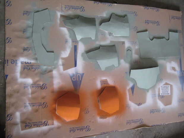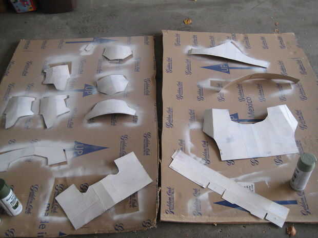 Bueno, si usted ha hecho este muy, muy grande! Si has aburrido de cartón, no te rindas! El resto del proyecto es muy divertido! Tu listo para pintar! recomiendo una capa base de pintura blanca. Aerosol-pintura funciona mejor, ya que no deja pinceladas. Trabajo en un área bien ventilada, con una lona debajo. Siga las instrucciones en la lata y cubra uniformemente cada pieza de la armadura con blanco. Deje que la primera capa seque y pasar con una capa blanca en segundo lugar. Una vez que haya secado la pintura blanca, utilice el color de elección para ir sobre la armadura, otra vez, asegurándose de la pintura uniformemente. Déjelo secar.