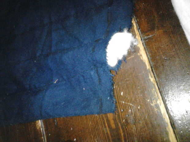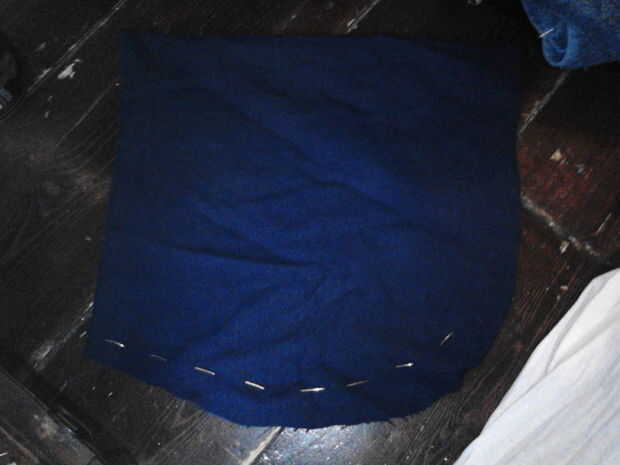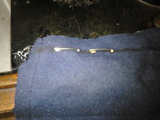 OK por lo que ambas mitades se cortan, la primera cosa a hacer es coser la parte inferior. Una vez hecho esto quitar el safetypins y lugar a través de la capa superior sólo! Ahora voltear todo adentro hacia fuera para que la costura está en el interior y el safetypins marca la línea (que está en el interior ahora).