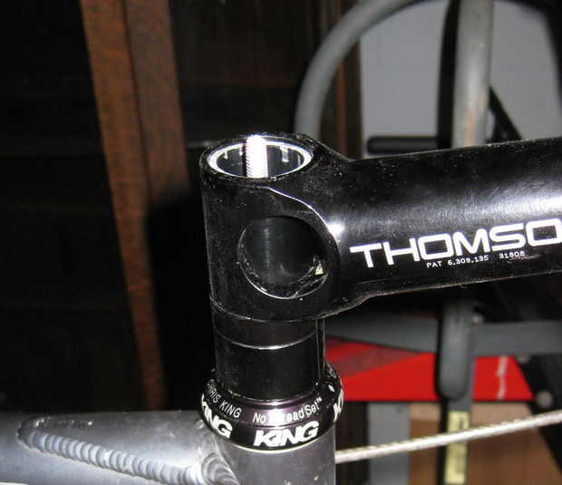 I rosca la varilla por la parte inferior del tubo de dirección hasta la mitad de una pulgada o así que se sobresalga de la parte superior del tubo. Esto tomó algún tiempo; Podría haber hecho una estimación inicial de la longitud y el corte inicial, pero no.