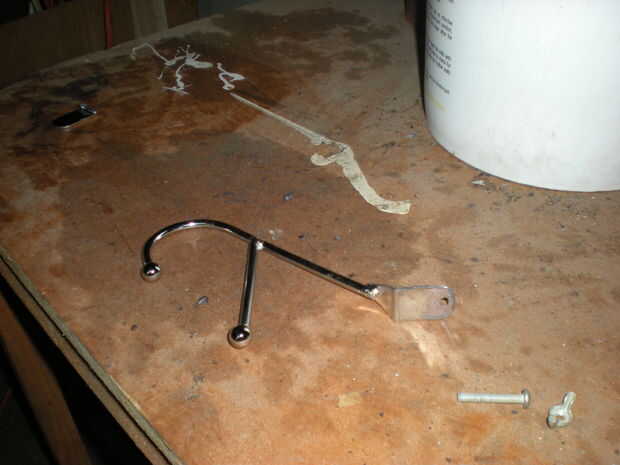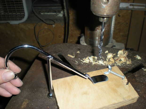 Siguiente ronda el filo a la izquierda por el corte y perfore un agujero para el perno. Usé una amoladora para redondo y un taladro para hacer el agujero. Puede que necesite iniciar el taladro con un punzón para que la broca permanece centro, acabado metal puede ser bastante resbaladiza. Un taladro de mano funcionará para el agujero pero no puedo pensar en otra herramienta que no sea una amoladora para redondear los bordes. Hacer el agujero un poco más grande que el tornillo se utiliza, de esa manera es fácil deslizarse cuando usted instale él. Cualquier tamaño perno y tuerca que tienes funcionará, siempre y cuando no sea demasiado gordo o demasiado.