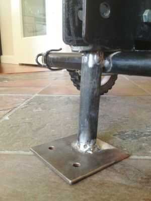 La clave para el almacenaje vertical de nuestra máquina de esquí de NordicTrack es un pie de apoyo que actúa en concierto con las ruedas que se menciona en el paso anterior. Una vez que las ruedas se adjunta, podría traer la máquina de esquí a una posición vertical y encontrar el lugar donde se estaba equilibrado para que la máquina no quiso caer hacia atrás o hacia adelante. Luego mide desde un punto conveniente en el marco al piso. Corté un trozo de tubo lo suficientemente largo para permitir hacer frente uno extremo para caber el contorno de la tubería del marco. Usé el proceso en este Instructable para hacer frente a la tubería de ajuste antes de soldar. Permitió un pie cuadrado de acero. (Por favor disculpen mi soldaduras descuidadas. Realmente no necesitan hacer tanto en esta solicitud.)