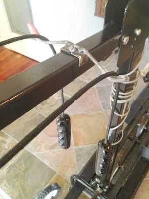 NordicTrack algunos modelos vienen equipado con restos de los extremos de la cuerda de mano. Nuestro no. He doblado un pedazo de varilla de 1/8 de pulgada y soldado con autógena dos pedazos finos en forma de "L" para que se ajuste alrededor de tubo cuadrado en el brazo del tambor. Al principio dejé tensión mantener los restos en su lugar. Desde entonces, he perforado un agujero y añadido un tornillo de chapa para sujetar firmemente los restos. Tubería del tanque de pescados o una guarnición de goma proteger manos de rugosidad en los extremos de la varilla.