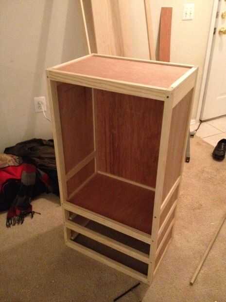 Una vez fue montada la parte posterior, cortar el revestimiento de la parte superior y media del armario (la parte superior de la primer cajón).  Luego até el marco superior de madera la cara del guardarropa de las puertas y cajones.