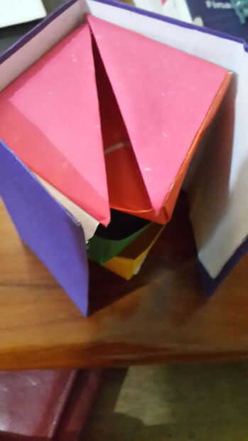 El rosa brillante tonos triangulares son a partir de edad así como tarjeta de felicitación y luego uno de ellos pegado a partes 1ª y 2ª y otro para 3 º y 4 º porción del esqueleto.