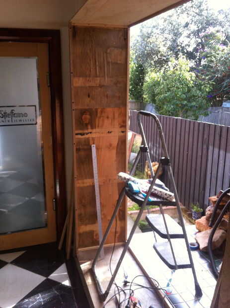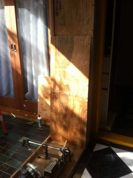 Luego medí la altura, longitud y profundidad de mi espacio.  Es aproximadamente 2.1 x 2.1 x.5 metros.  Me corte mi marco exterior a estas medidas y atornillada en el marco de madera de las puertas correderas.