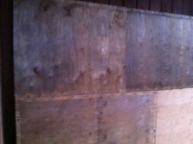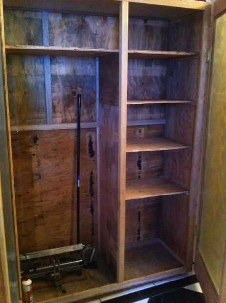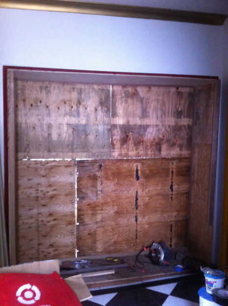 Cortar la caja de embalaje de madera contrachapada para rellenar en la parte trasera del armario y luego sujeta los paneles con battons pegados y atornillados.